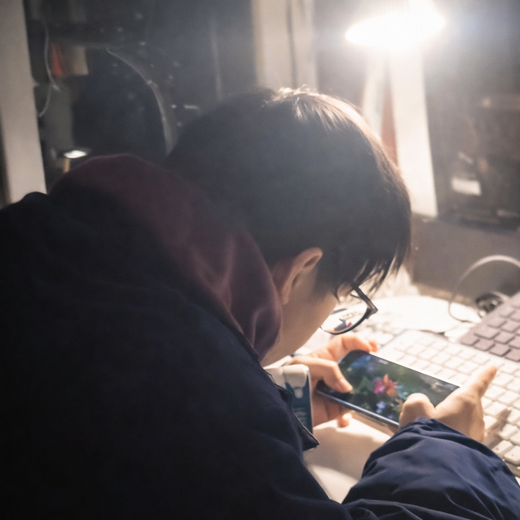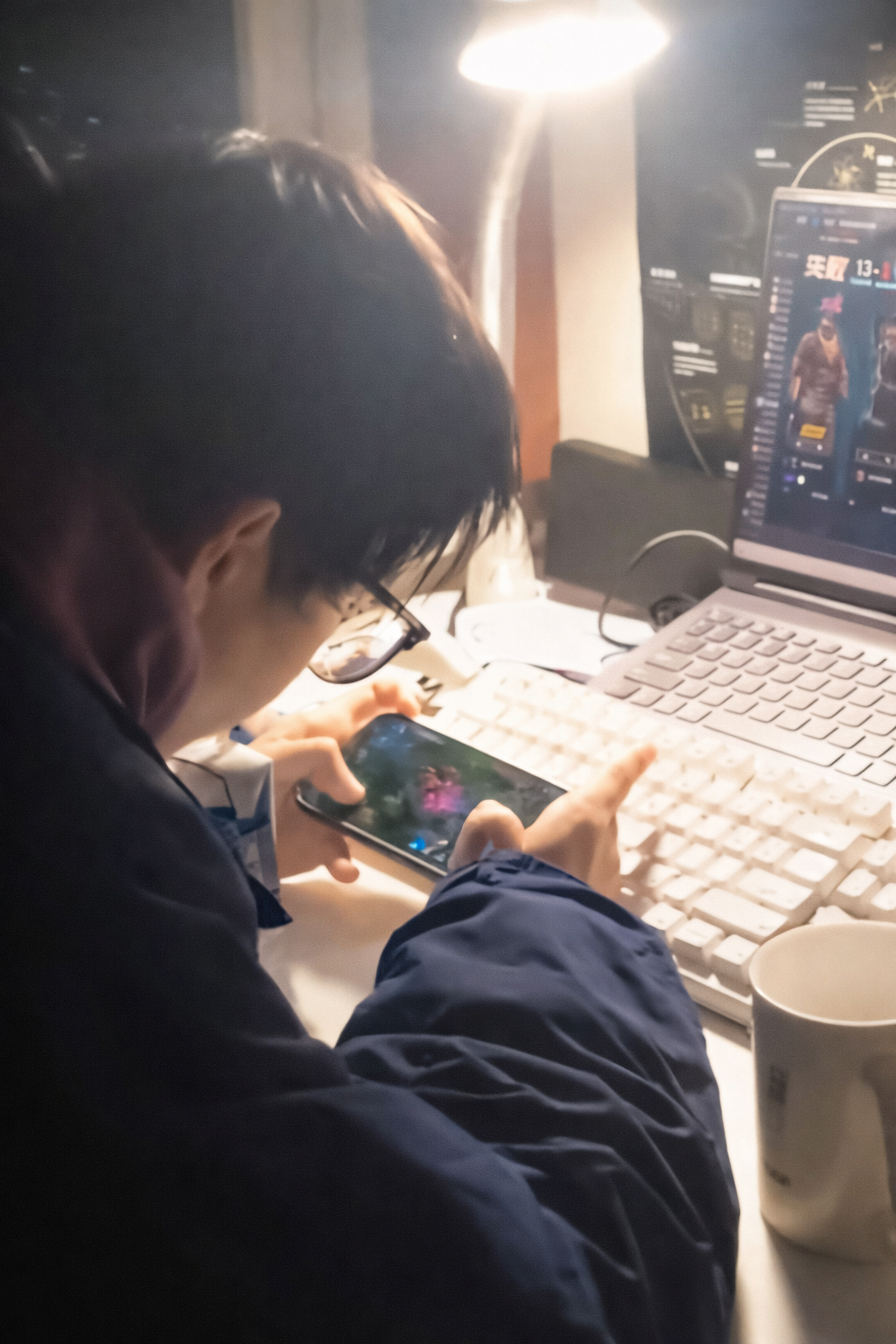 Khoảng 2 giờ sáng, trong lúc thức dậy đi vệ sinh, bà thấy đèn phòng con vẫn sáng. Tò mò bước vào, bà sững người khi thấy con trai cầm điện thoại chơi game, còn màn hình máy tính xách tay cũng hiện rõ giao diện trò chơi.