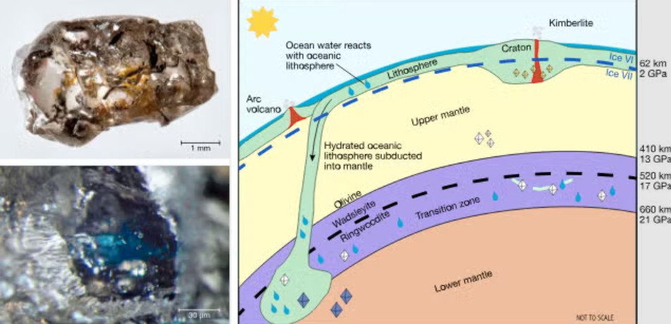 Viên kim cương, được đưa lên bề mặt Trái Đất bởi một loại đá núi lửa có nguồn gốc sâu xa gọi là kimberlite, có chứa tạp chất ringwoodite.