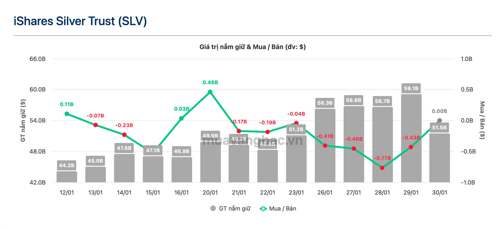 Theo cập nhật mới nhất từ muavangbac.vn, quỹ bạc lớn nhất thế giới iShare Silver Trust (SLV) đã ngừng bán ra trong ngày 30/1. Theo đó quỹ nắm giữ khoảng 15,5 nghìn tấn, giá trị 51,5 tỷ USD.