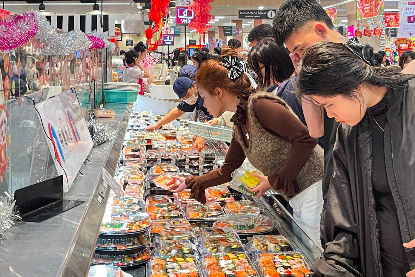 Trung tâm thương mại tấp nập khách ra vào. Nhiều người tranh thủ mua sắm thêm thực phẩm tươi sống sau dịp Tết.