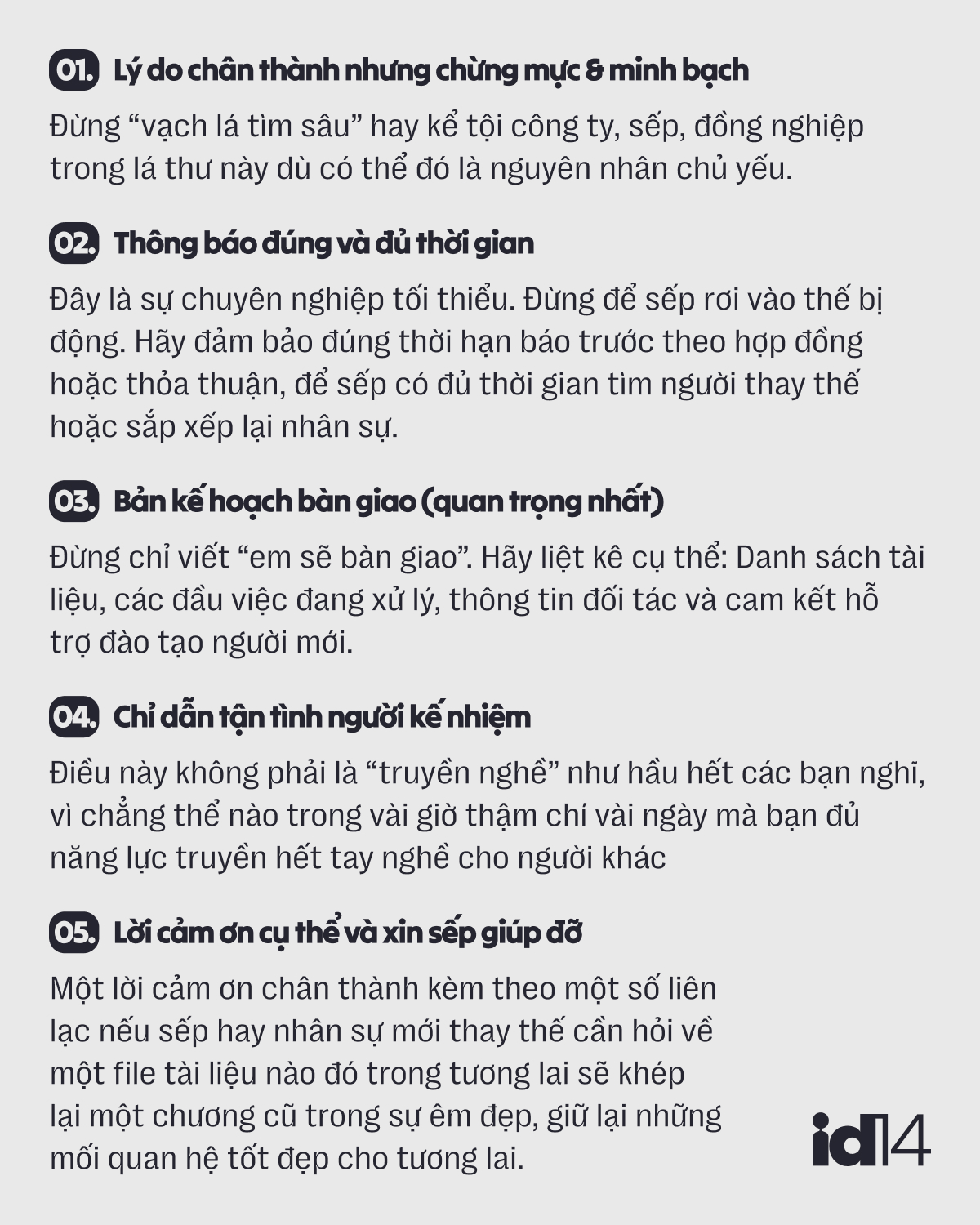 2. Thông báo đúng và đủ thời gian: Đây là sự chuyên nghiệp tối thiểu. Đừng để sếp rơi vào thế bị động. Hãy đảm bảo đúng thời hạn báo trước theo hợp đồng hoặc thỏa thuận, để sếp có đủ thời gian tìm người thay thế hoặc sắp xếp lại nhân sự. Nhiều bạn thích báo thời gian sát rạt thậm chí trừ ngày phép chưa dùng hết khiến ngày làm việc cuối có khi chỉ còn 1-2 tuần là kết thúc. Cách làm này rất kém duyên và kém cả phẩm chất của một người tử tế.