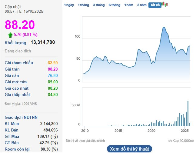 Ngay từ phiên sáng, cổ phiếu Tập đoàn Masan (mã: MSN) do ông Nguyễn Đăng Quang làm Chủ tịch HĐQT bất ngờ tăng kịch trần, thậm chí “trắng bên bán” qua đó leo lên mức giá 88.200 đồng/cp. Thanh khoản tại cổ phiếu MSN cũng tăng cao đột biến với hơn 13 triệu đơn vị được “sang tay” (tính đến 10h phiên 16/10).