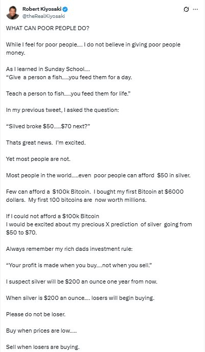 Nhắc lại dòng tweet trước đó của mình, Kiyosaki cho biết: “Giá bạc đã vượt qua mốc 50 USD và có thể hướng đến 70 USD. Đây là tin tức khiến tôi rất phấn khích.” Ông cho rằng ở mức giá hiện tại, nhiều người vẫn có thể dễ dàng tiếp cận bạc như một kênh đầu tư, trước khi giá có thể tăng mạnh hơn trong năm tới.