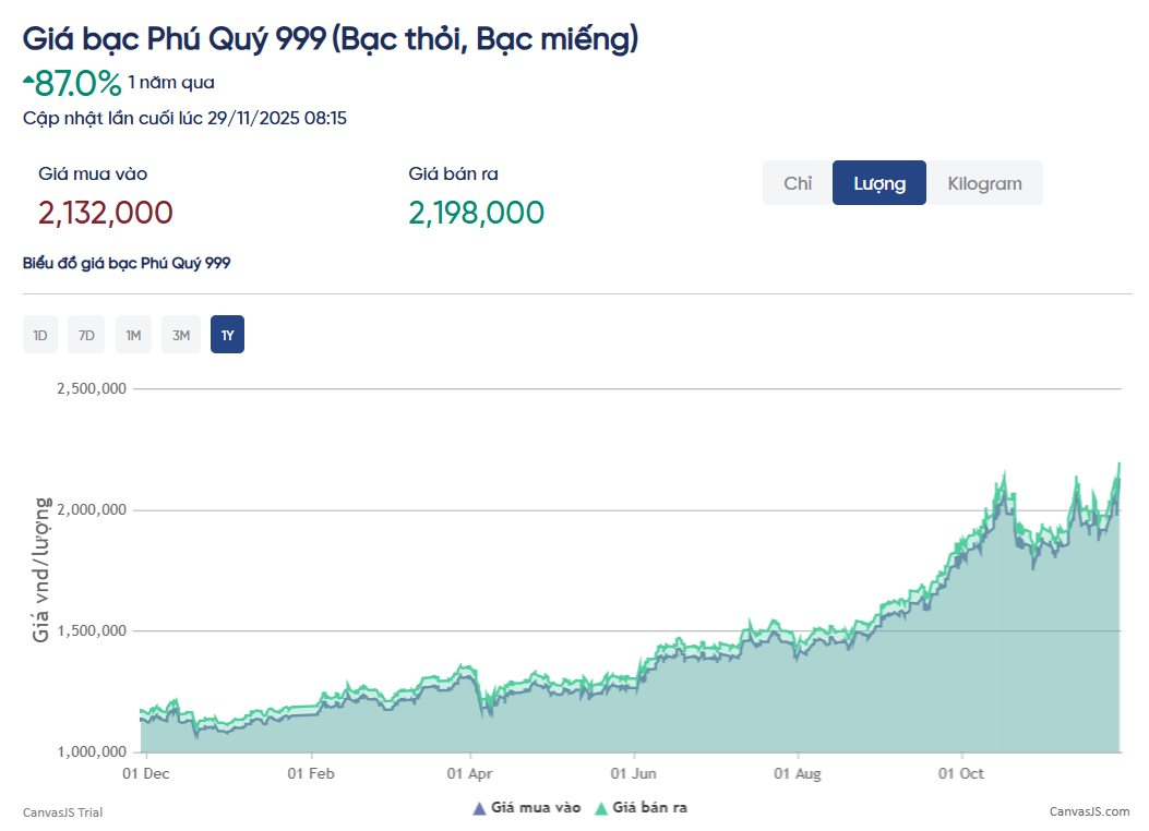 Tại thị trường trong nước, theo dữ liệu từ Tập đoàn Vàng bạc Đá quý Phú Quý, bạc 999 1 lượng niêm yết ở mức 2.132.000 đồng/lượng (mua vào) và 2.198.000 đồng/lượng (bán ra). Kim loại trắng đã lấy lại mức tăng hơn 11,2% trong 1 tuần qua, sau khi lao dốc vào phiên đầu tuần. Điều này giúp bạc tăng 87% trong 1 năm, vượt mức tăng của giá vàng nhẫn (70%).