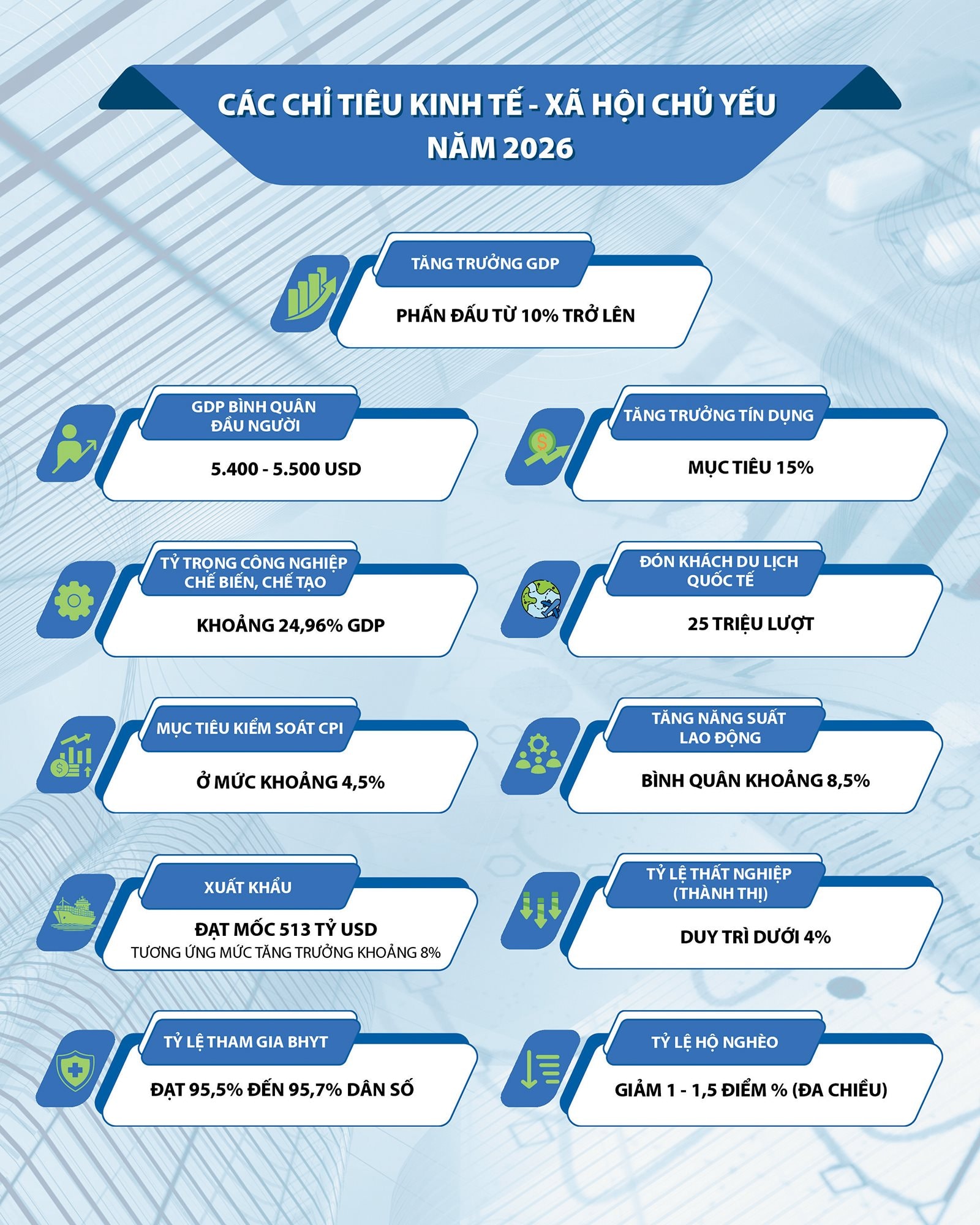 Bộ trưởng Tài chính Nguyễn Văn Thắng cho biết, giai đoạn 2026-2030 là giai đoạn đất nước ta tăng tốc, bứt phá, bước vào kỷ nguyên mới để hiện thực hóa khát vọng trở thành nước phát triển, thu nhập cao vào năm 2045. Cụ thể, mục tiêu phấn đấu tốc độ tăng trưởng GDP bình quân từ 10%/năm trở lên để phát triển nhanh, bền vững; cải thiện và nâng cao toàn diện đời sống Nhân dân, GDP bình quân đầu người đến năm 2030 đạt khoảng 8.500 USD; tổng vốn đầu tư toàn xã hội khoảng 40% GDP; huy động ngân sách đạt 18% GDP, bội chi khoảng 5% GDP.
