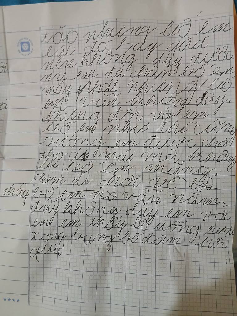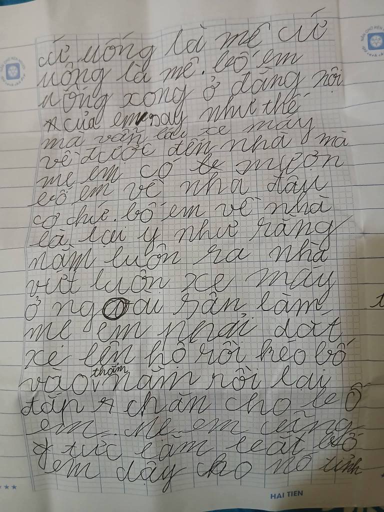 “Hôm nay thấy ngăn bên hông balo con có rác, mình moi ra vứt đi, vô tình đọc được bài văn của con. Chắc con viết ở lớp” - một bà mẹ chia sẻ trên mạng xã hội, kèm theo tấm ảnh chụp lại bài văn học trò nguệch ngoạc chữ, giấy đã nhàu và lem mực. Bài viết nhanh chóng thu hút hàng chục nghìn lượt tương tác. Nhiều người thú nhận: đọc thì bật cười, nhưng đọc xong lại thấy nghèn nghẹn.