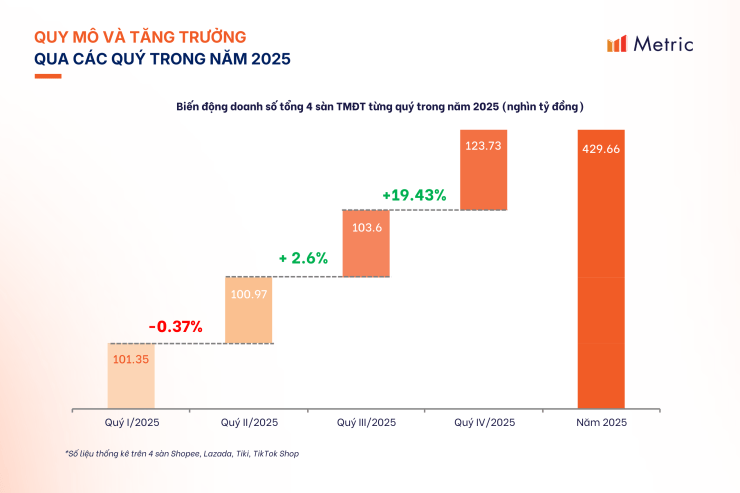 Theo Báo cáo Thị trường Thương mại Điện tử Việt Nam 2025 của Metric, tổng doanh số TMĐT trên bốn sàn gồm Shopee, TikTok Shop, Lazada và Tiki đạt 429,7 nghìn tỷ đồng, tăng 34,75% so với năm 2024. Mức tăng trưởng hai con số này được thúc đẩy bởi chuỗi các sự kiện mua sắm lớn xuyên suốt năm, bao gồm Tết Nguyên Đán, Sale Hè 6.6, Đại Lễ Hội 8.8, Siêu Sale 9.9, Ngày Độc Thân 11.11, và đặc biệt là chuỗi Sale cuối năm 12.12 kéo dài đến Black Friday.