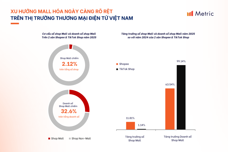 Dữ liệu Metric cho thấy, dù chỉ chiếm 2,12% tổng số shop đang hoạt động trên Shopee và TikTok Shop trong năm 2025, nhóm Shop Mall lại đóng góp tới 32,6% tổng doanh số của hai nền tảng này .