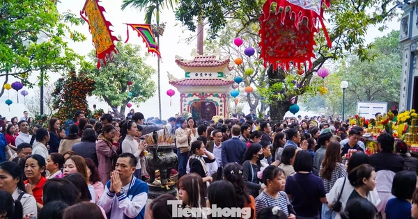 Ngay trong ngày làm việc đầu tiên của năm mới, hàng nghìn dân công sở Hà Nội đã tranh thủ giờ nghỉ trưa đổ về Phủ Tây Hồ. Lối vào kẹt cứng, khu vực sân chật như nêm bởi dòng người hối hả dâng lễ cầu tài, cầu lộc.