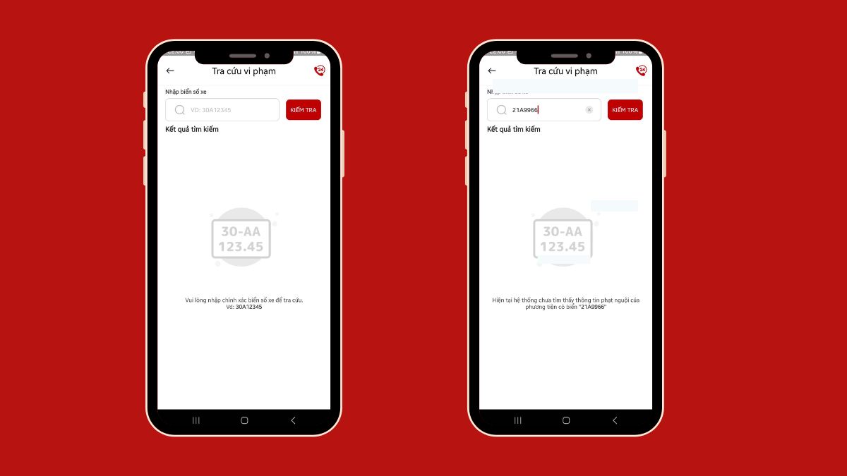 Lưu ý: Bạn hãy nhập liền mạch, không dùng dấu chấm (.) hoặc gạch ngang (-). Ví dụ: biển số 30-AA123.45 nhập là 30AA12345 ➤ Nhấn “Kiểm tra”.
