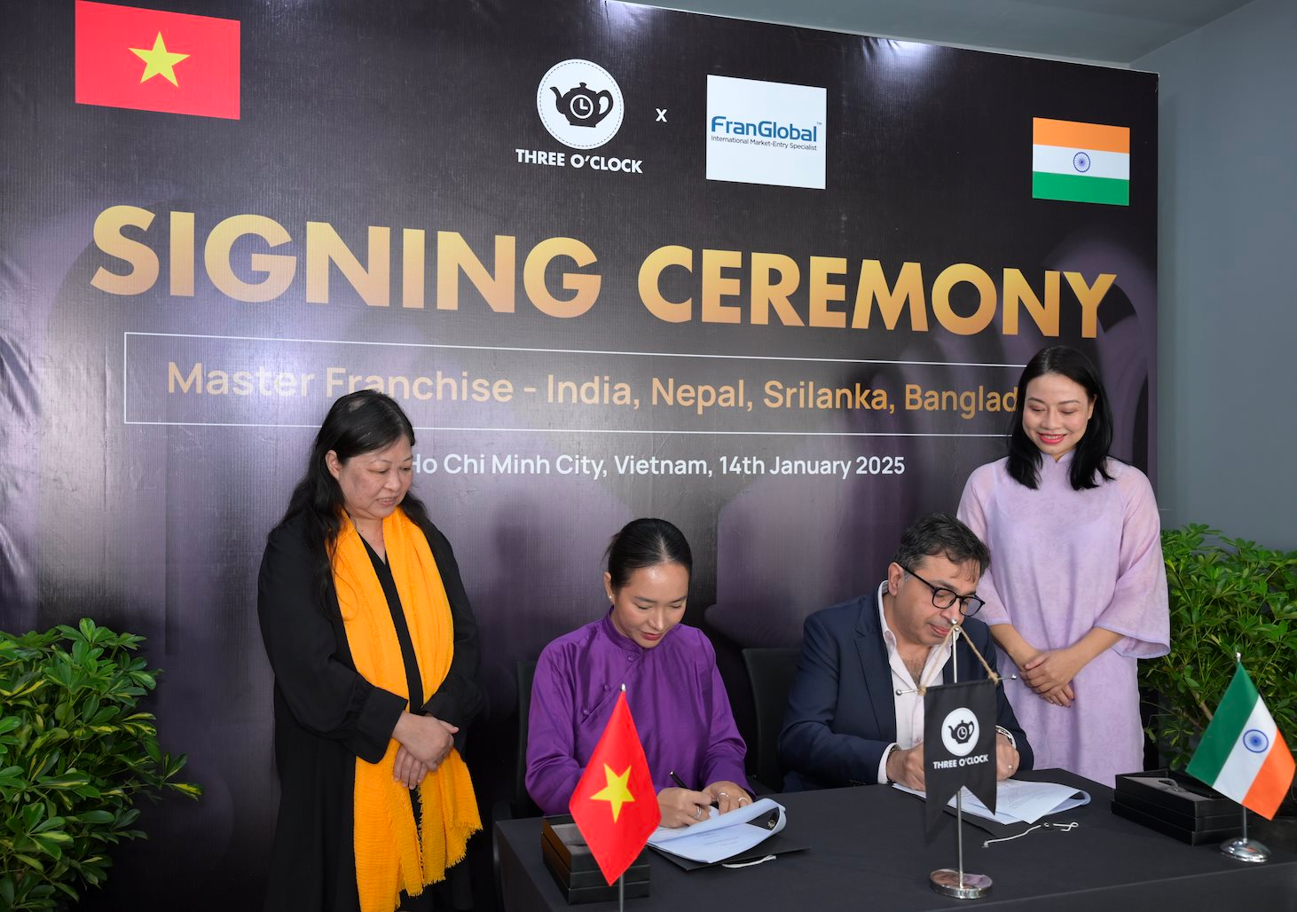 Đầu năm 2025, thông tin Three O’Clock ký hợp đồng nhượng quyền độc quyền với FranGlobal (Ấn Độ) khiến giới F&B Việt Nam xôn xao. Theo thỏa thuận, tập đoàn chuyên nhượng quyền quốc tế này sẽ phát triển hệ thống Three O’Clock tại Ấn Độ, Nepal, Sri Lanka và Bangladesh, với cam kết mở ít nhất 100 cửa hàng trong 10 năm.