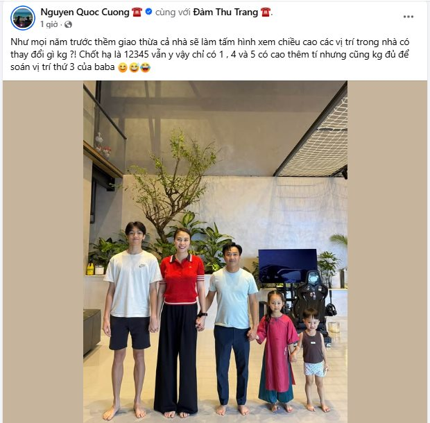 Doanh nhân phố núi đứng bên các con, tay nắm tay, thể hiện sự gắn kết của các thành viên trong gia đình. Cách sắp xếp “hàng cao – thấp” hài hước theo đúng chia sẻ trong phần caption giúp bức ảnh thêm đời thường, mang đúng tinh thần “điểm danh chiều cao” đầu năm để xem vị trí trong nhà có thay đổi hay không. Đây cũng là phong cách quen thuộc của Cường Đô La – luôn lồng ghép yếu tố vui vẻ, dí dỏm khi nói về người thân trên mạng xã hội, thay vì những câu chữ quá trịnh trọng.