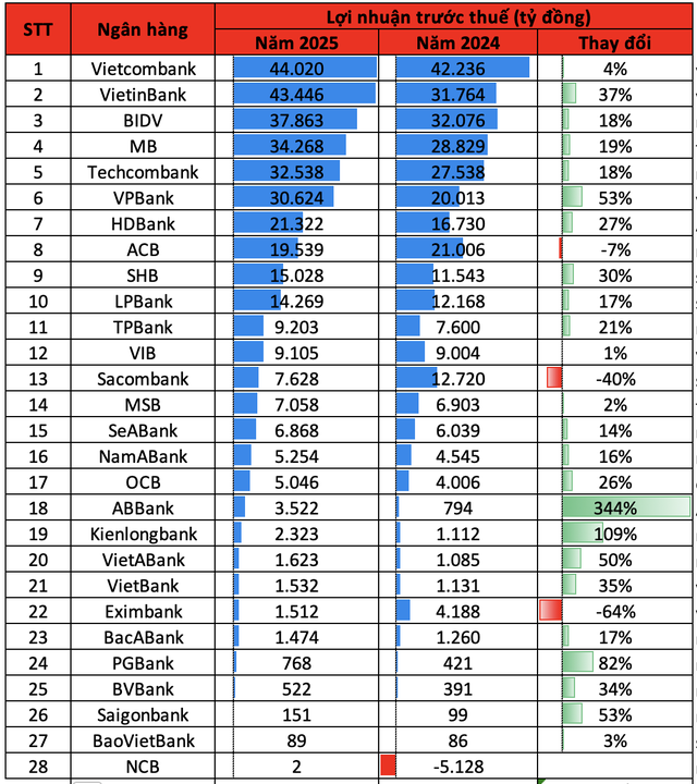 Trong nhóm ngân hàng tư nhân quy mô lớn, lợi nhuận năm 2025 ghi nhận nhiều điểm sáng. Techcombank ghi nhận 32.538 tỷ đồng, tăng 18%. Đáng chú ý, VPBank vươn lên mạnh mẽ với 30.624 tỷ đồng, tăng tới 53%, trở thành một trong những ngân hàng có mức tăng lợi nhuận cao nhất trong nhóm quy mô lớn.