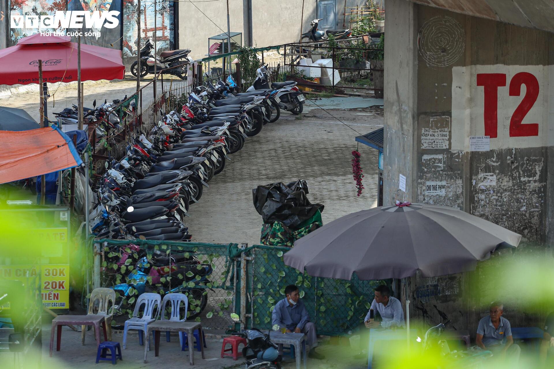 Tại khu vực chân cầu T2, lối lên từ Nguyễn Khoái, bãi đỗ xe vẫn còn hoạt động với hàng chục xe máy gửi bên trong.