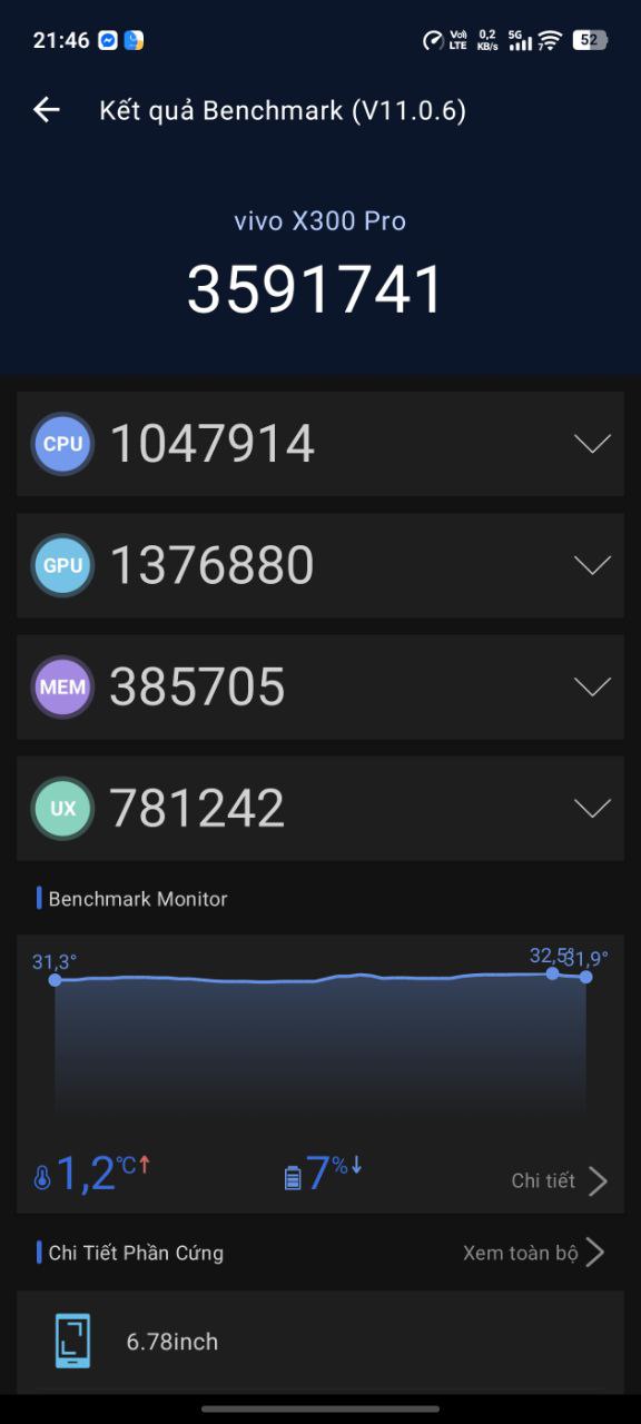 vivo X300 Pro được trang bị vi xử lý Dimensity 9500 tám nhân với xung nhịp tối đa 4,21 GHz, kết hợp RAM 16 GB và bộ nhớ trong 512 GB. Cấu hình này mang lại hiệu suất mạnh mẽ, xử lý mượt mà các tác vụ nặng như quay video 4K, chỉnh ảnh RAW hoặc dựng clip ngay trên máy. Điểm Antutu V11 đạt hơn 3,59 triệu - trong đó GPU chiếm gần 1,38 triệu điểm - cho thấy khả năng xử lý đồ họa vượt trội. Đáng chú ý, máy chỉ nóng nhẹ trong suốt quá trình thử nghiệm, với mức nhiệt ổn định quanh 32 độ C.