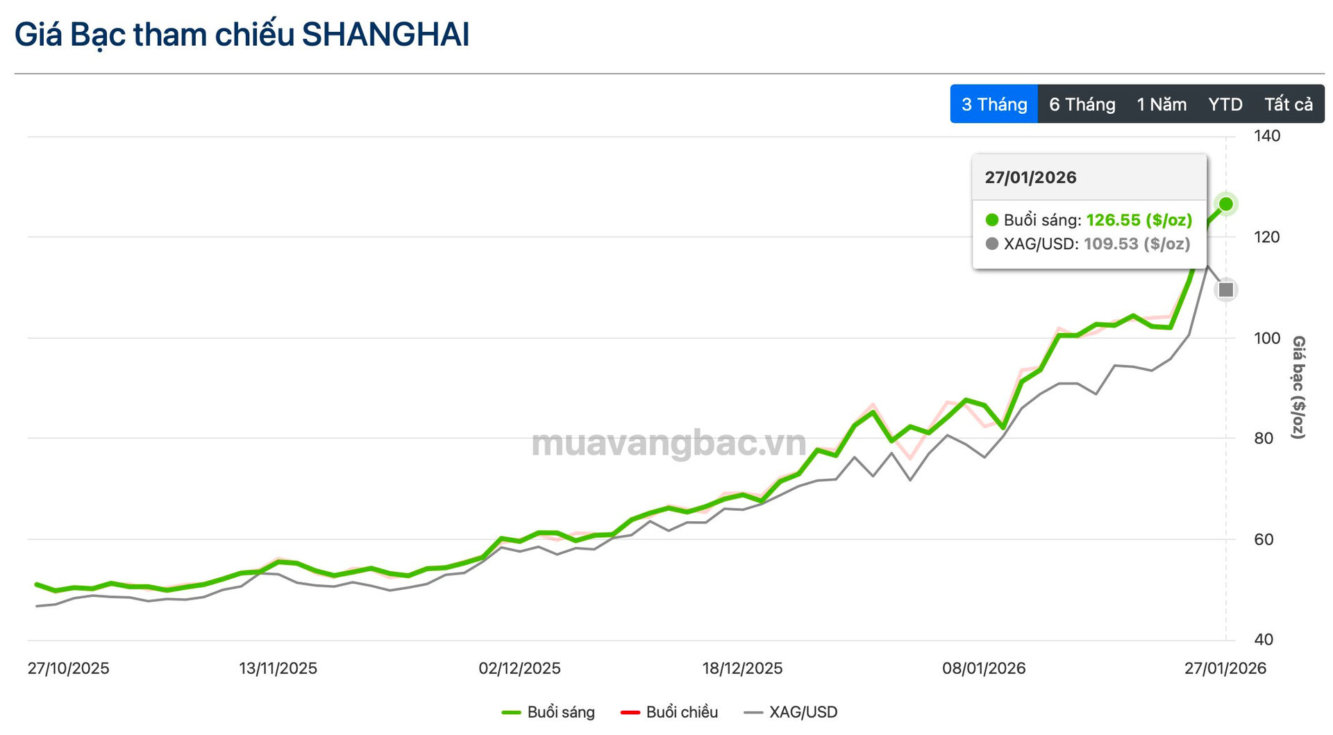 Cơn khát bạc tại Trung Quốc chưa hề có dấu hiệu hạ nhiệt đẩy giá bạc vật chất tại Thượng Hải lên trên 126,5 USD/oz, cao nhất từ trước đến nay. Từ đầu năm, giá kim loại quý này đã tăng gần 54% tại thị trường tỷ dân. Đà tăng không nghỉ khiến chênh lệch so với giá bạc giao dịch trên sàn COMEX (Mỹ) lên mức kỷ lục hơn 17 USD/oz.