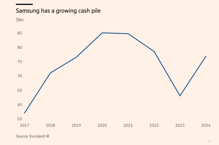 Là một trong những nhà sản xuất chip và điện tử lớn nhất thế giới, Samsung bị tụt sau SK Hynix và Micron trong cuộc đua cung ứng bộ nhớ tiên tiến cho hạ tầng AI. Tập đoàn Hàn Quốc chịu sức ép ngày càng lớn từ cổ đông phải dùng núi tiền mặt 108,5 nghìn tỷ won (74 tỷ USD) để tăng tốc ở AI, thiết kế chip và phần mềm.