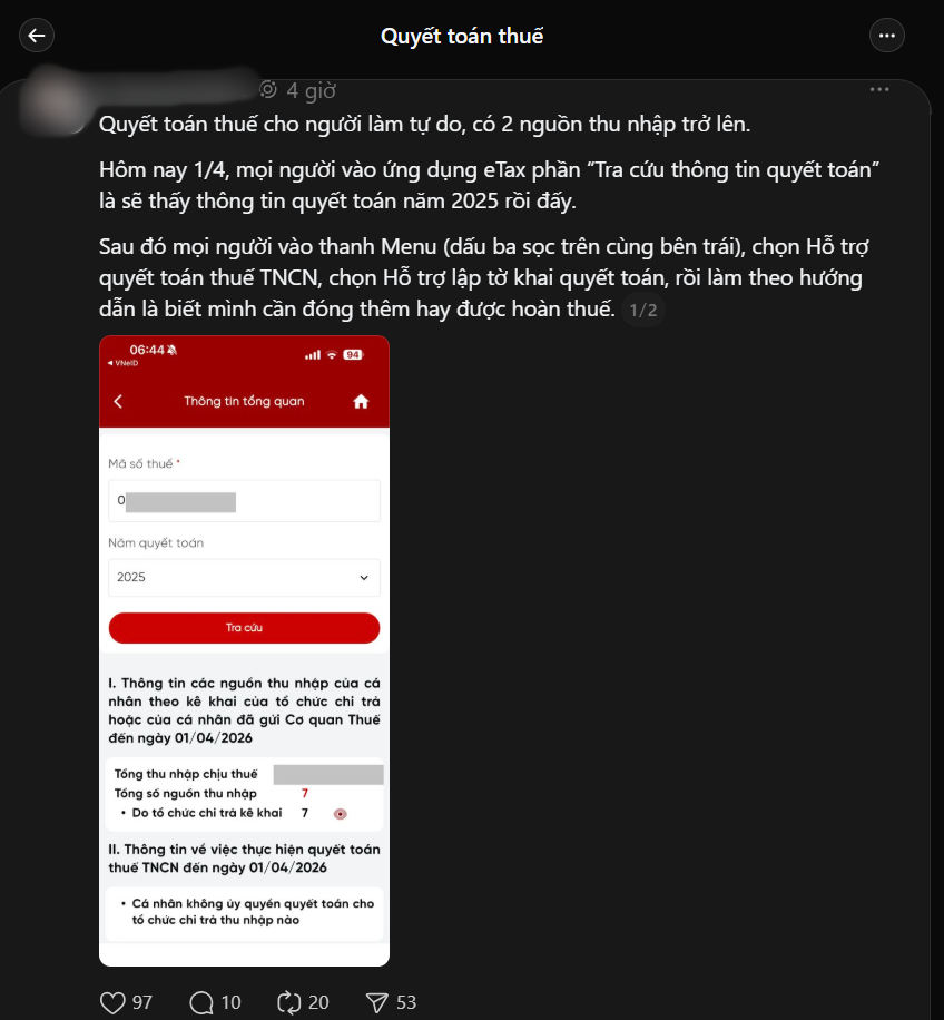 Hôm nay 1/4 là 1 ngày sôi động của thuế trên MXH khi mọi người không ngừng chia sẻ về một ứng dụng quan trọng. Điển hình như trên Threads, rất nhiều bài viết chia sẻ "Hướng dẫn quyết toán thuế TNCN", “Cách hoàn thuế lên tới vài triệu đồng”... được lan tỏa rộng rãi. Theo đó, dân tình liền ùn ùn rủ nhau kiểm tra tình trạng thuế của mình.