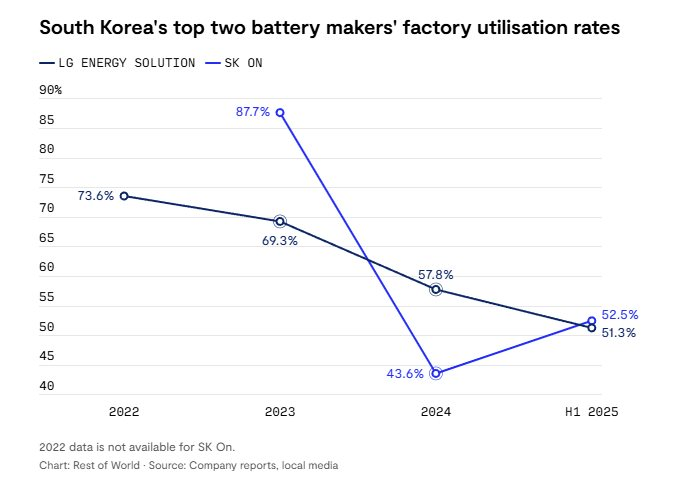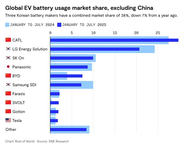 Tờ Rest of World (RoT) cho hay thị phần ngoài Trung Quốc của ba ông lớn Hàn Quốc đã giảm xuống chỉ còn 38%, thấp hơn 7 điểm phần trăm so với năm trước. Các nhà máy từng là niềm tự hào quốc gia nay chỉ hoạt động một nửa công suất, trong khi CATL duy trì mức 90%. Thậm chí số liệu của SNE Reseach cho thấy công suất của nhà máy LG Energy đã giảm trong 4 năm liên tiếp.
