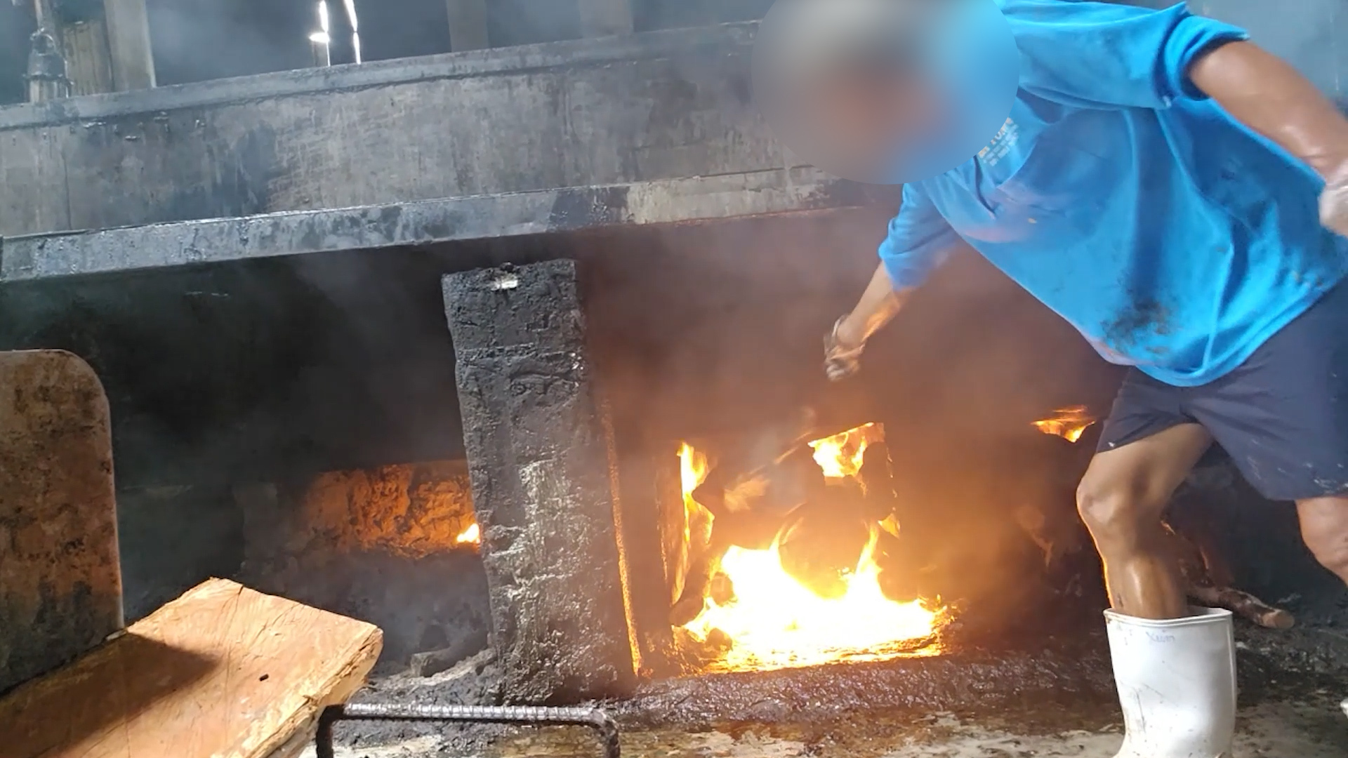 Tại đây, lò nấu được đốt bằng củi bàng, xà cừ và me, khiến khói đen đặc quánh bốc lên nghi ngút suốt ngày, lan ra môi trường xung quanh. Bên trong khu nhà xưởng rộng hàng trăm mét vuông, khi vừa bước vào, chúng tôi lập tức cảm thấy ngột ngạt bởi khói và mùi dầu khét lẹt bám đặc trong không khí.