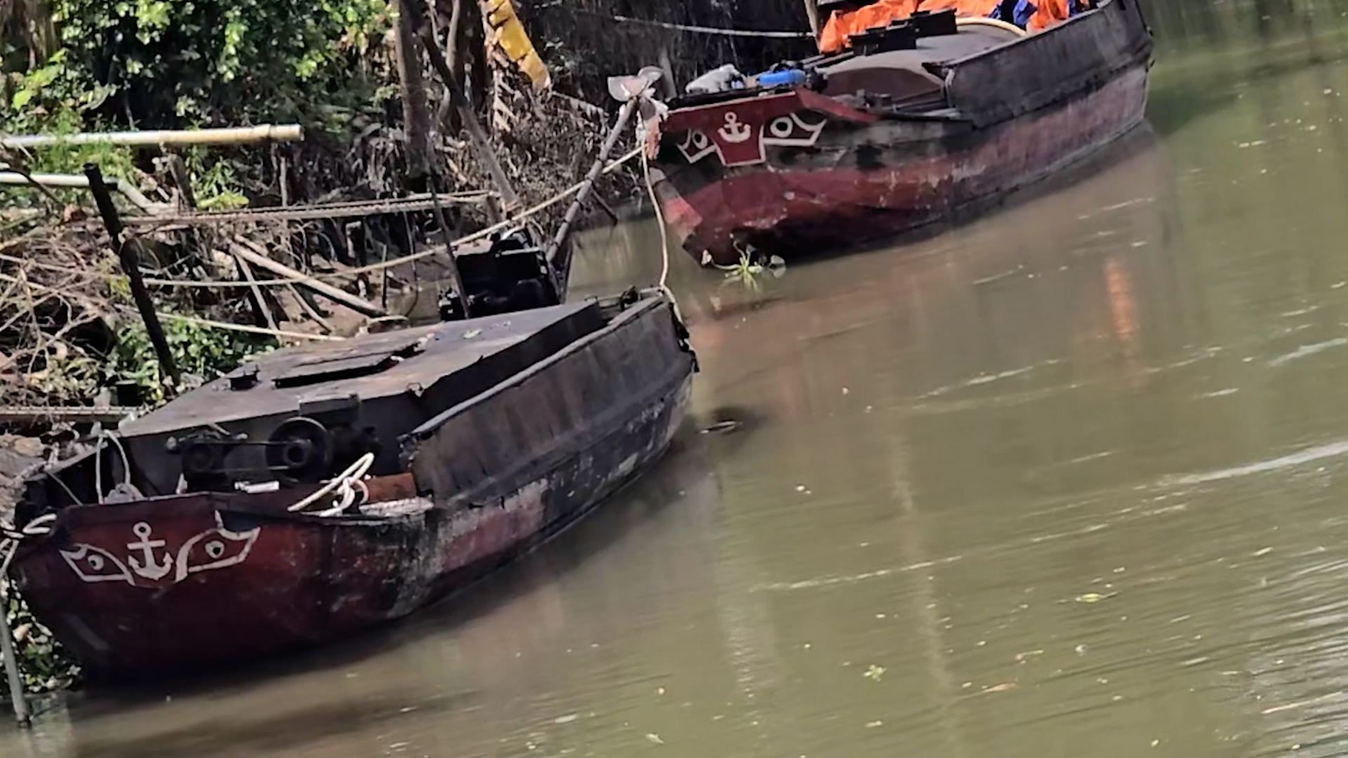 Hai chiếc ghe có bồn chở dầu neo đậu trước cơ sở ông Nghĩa.