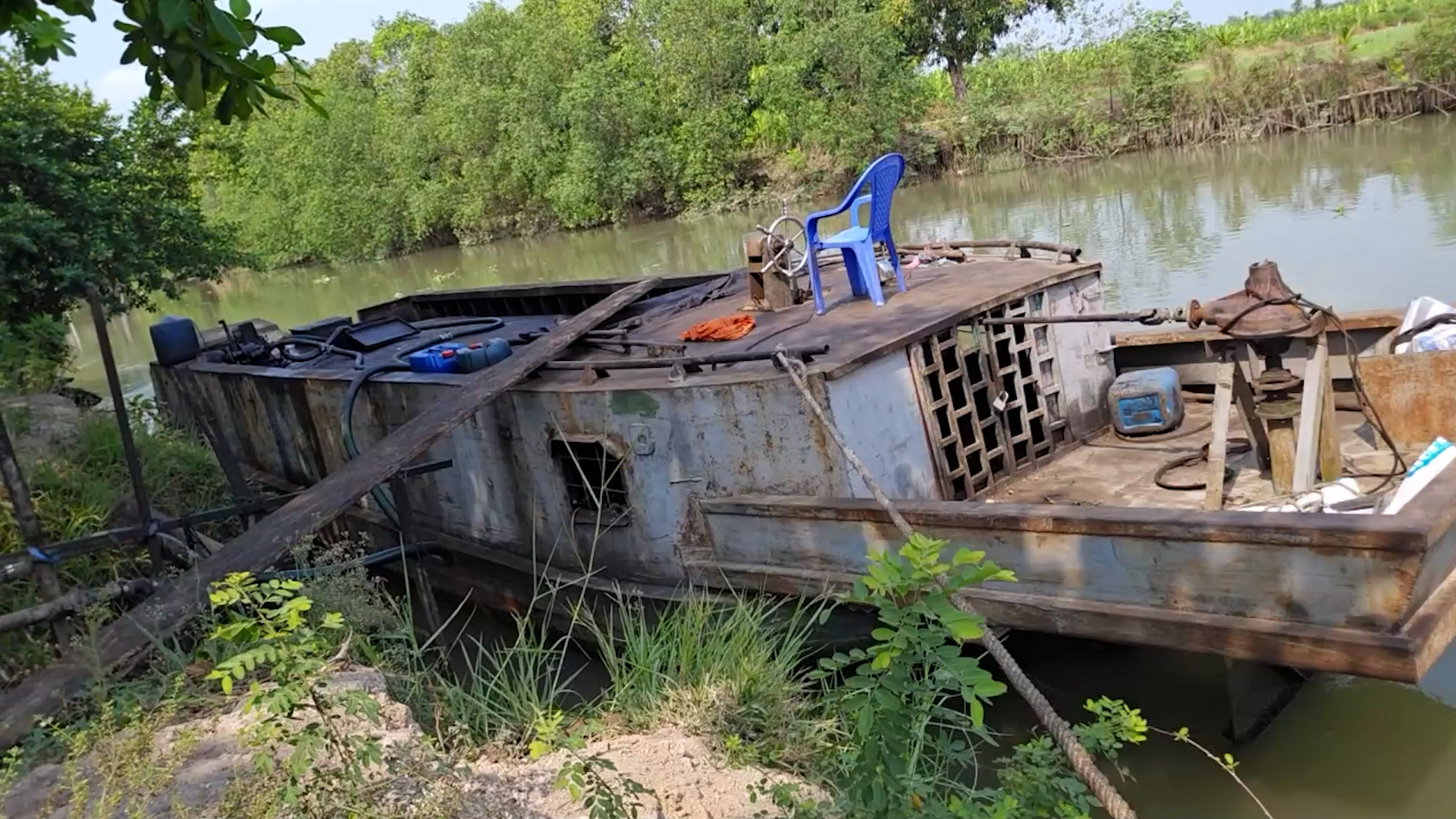 Chiếc ghe đang bơm hàng nghìn lít nhớt thải vào cơ sở của ông Nghĩa bằng vòi.