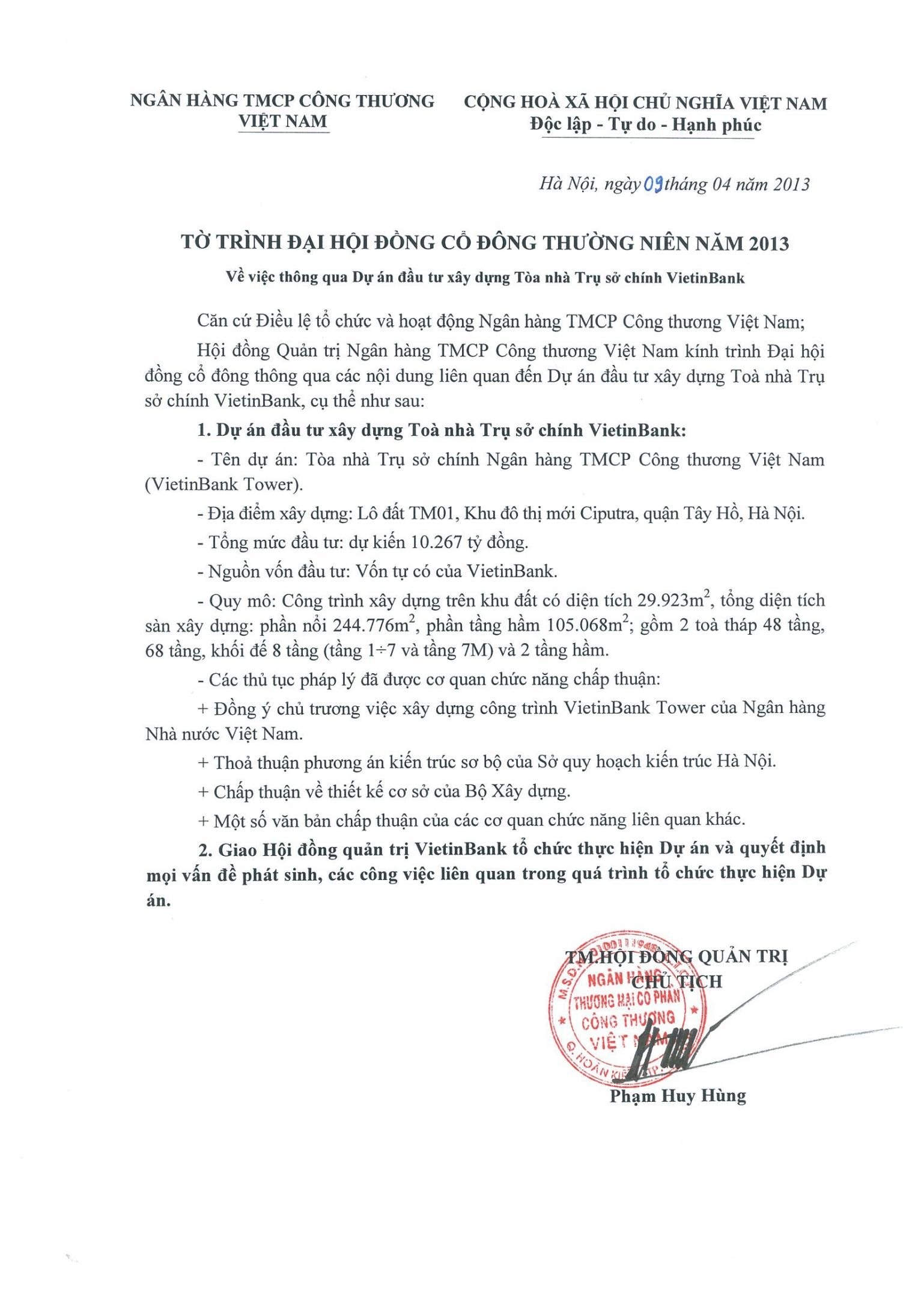 Được biết, theo kế hoạch, dự án VietinBank Tower có tổng vốn đầu tư 10.267 tỷ đồng và được xây dựng trên diện tích khu đất gần 30.000 m2 gồm 2 tòa tháp. Tòa tháp thứ nhất cao 68 tầng được thiết kế và dùng làm trụ sở làm việc chính của VietinBank. Tòa tháp thứ hai cao 48 tầng là khu tổ hợp của khách sạn 5 sao, căn hộ cao cấp cho thuê. Ban đầu, dự án VietinBank Tower dự kiến hoàn thành vào năm 2014. Tuy nhiên đến nay dự án vẫn đang dang dở.
