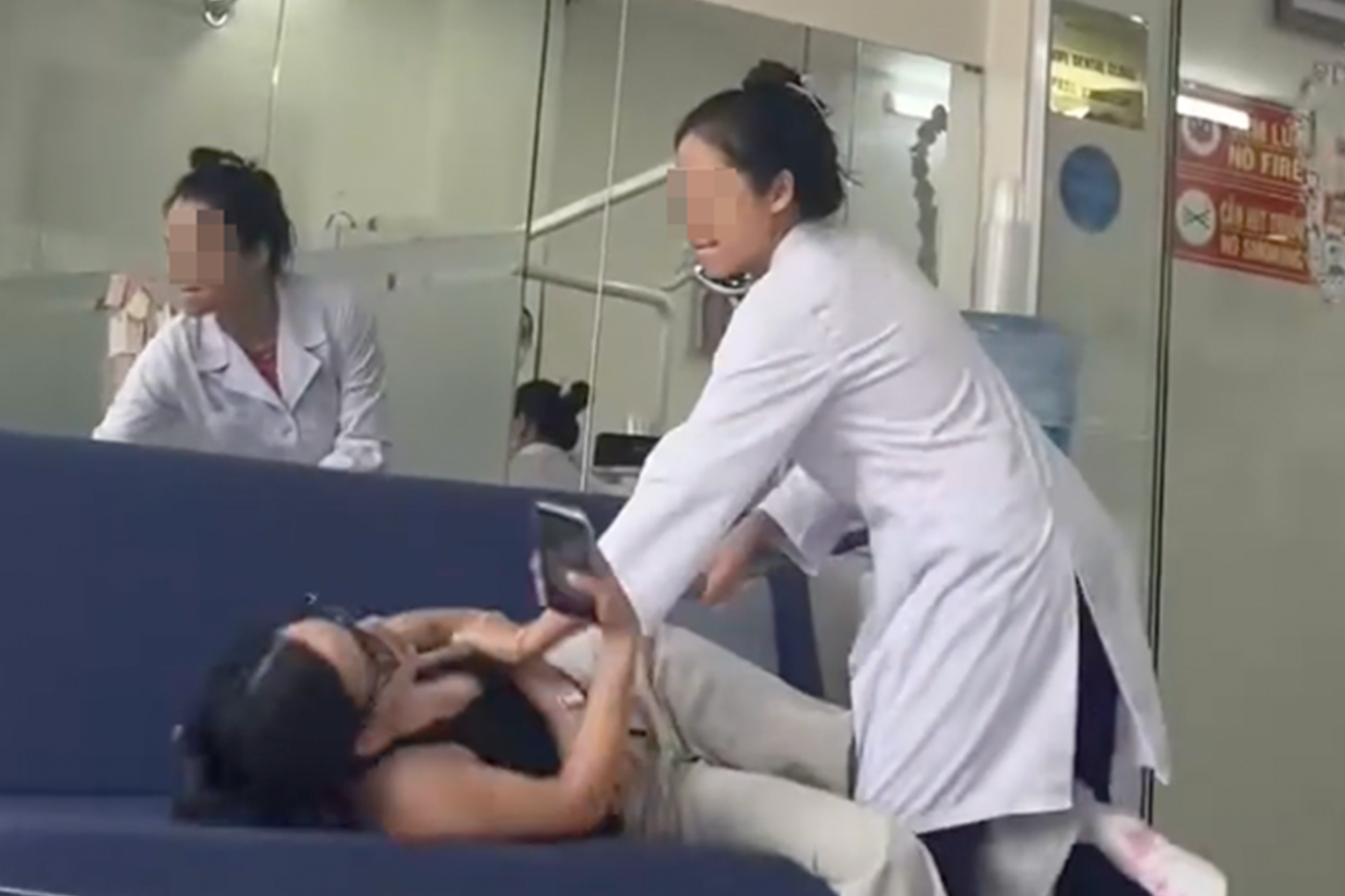Tại đây, bệnh nhân đã dùng điện thoại ghi hình lại cuộc trò chuyện. Lúc này, một phụ nữ mặc áo Blouse bất ngờ lấy gậy đe dọa, xô ngã bệnh nhân. Đồng thời, giật điện thoại trên tay bệnh nhân đập xuống đất.
