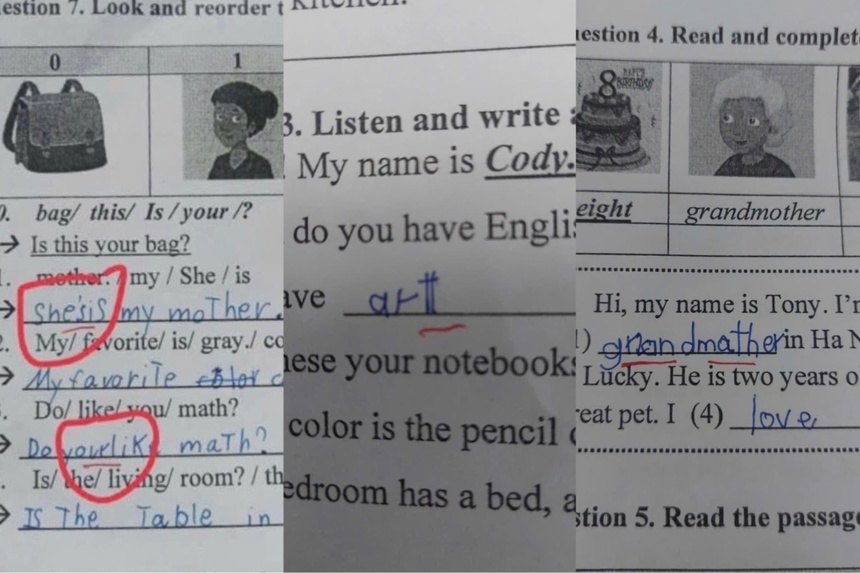 Bài thi của các học sinh bị cô giáo sửa bằng cách thêm nét vào chữ cái, thêm từ vào câu trả lời để làm sai kết quả.