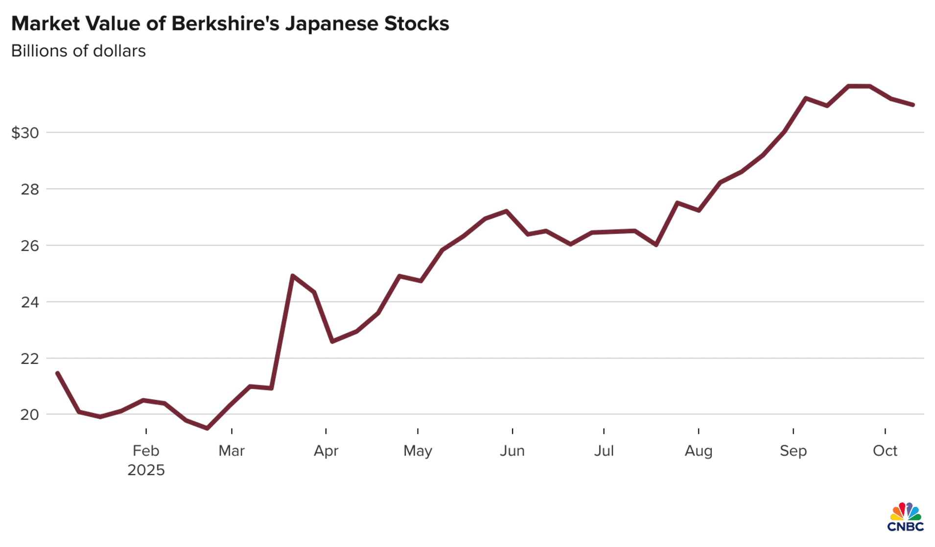 Giá trị thị trường (tính bằng tỷ USD) của danh mục cổ phiếu Nhật Bản mà Berkshire Hathaway nắm giữ, trong giai đoạn từ tháng 1 đến tháng 10 năm 2025.