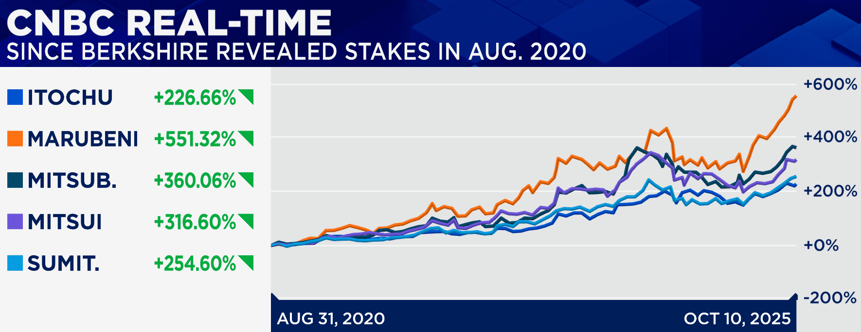 Biến động giá cổ phiếu của 5 tập đoàn thương mại lớn Nhật Bản kể từ khi Bershire tiết lộ khoản đầu tư vào tháng 8/2020 đến ngày 10/10/2025.