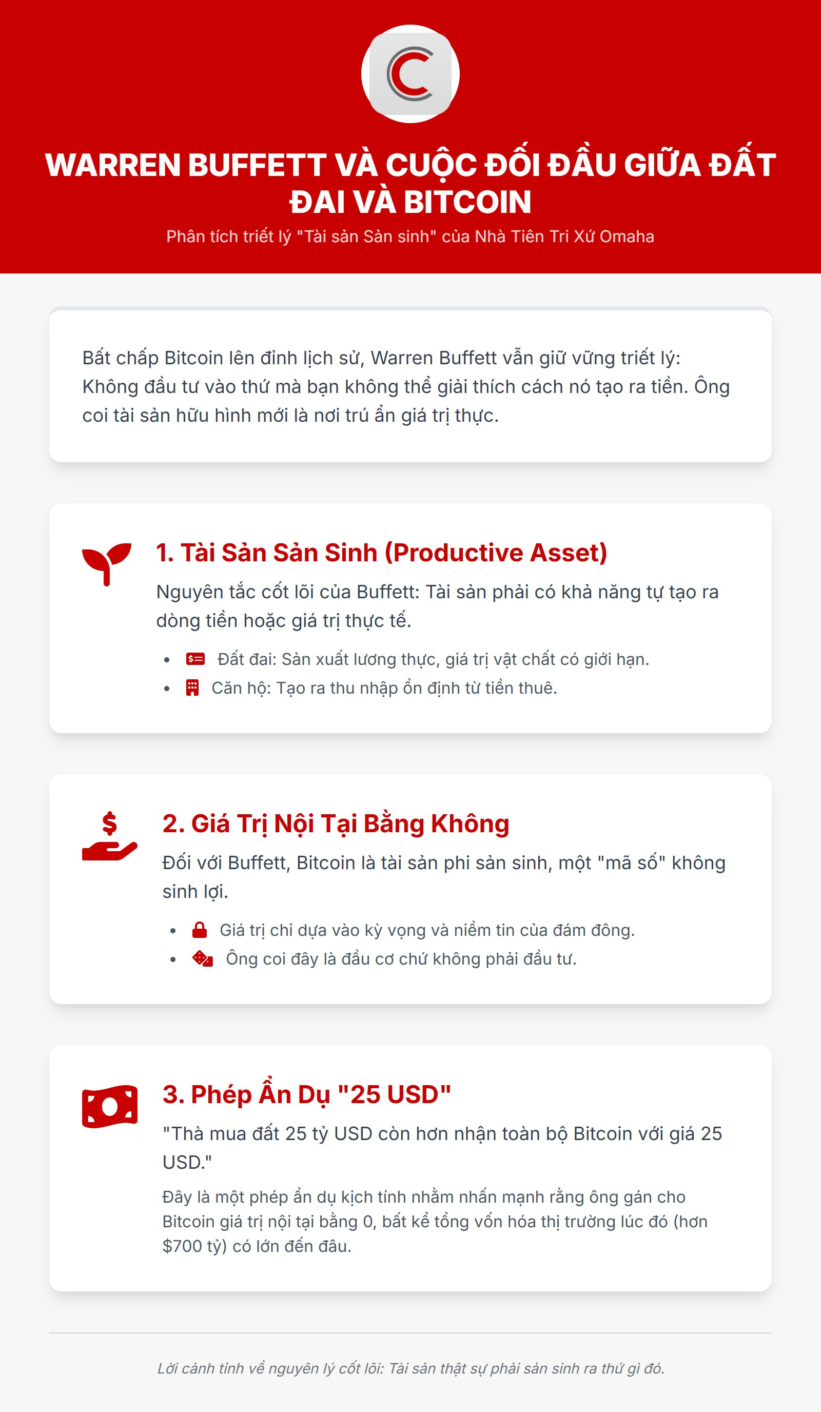 Việc Buffett sẵn sàng chi 25 tỷ USD cho 1% đất nông nghiệp Mỹ, nhưng lại từ chối toàn bộ Bitcoin với giá chỉ 25 USD là một phép ẩn dụ mạnh mẽ. Nó không phải là về khả năng chi trả, mà là về việc ông gán cho Bitcoin giá trị nội tại bằng 0.