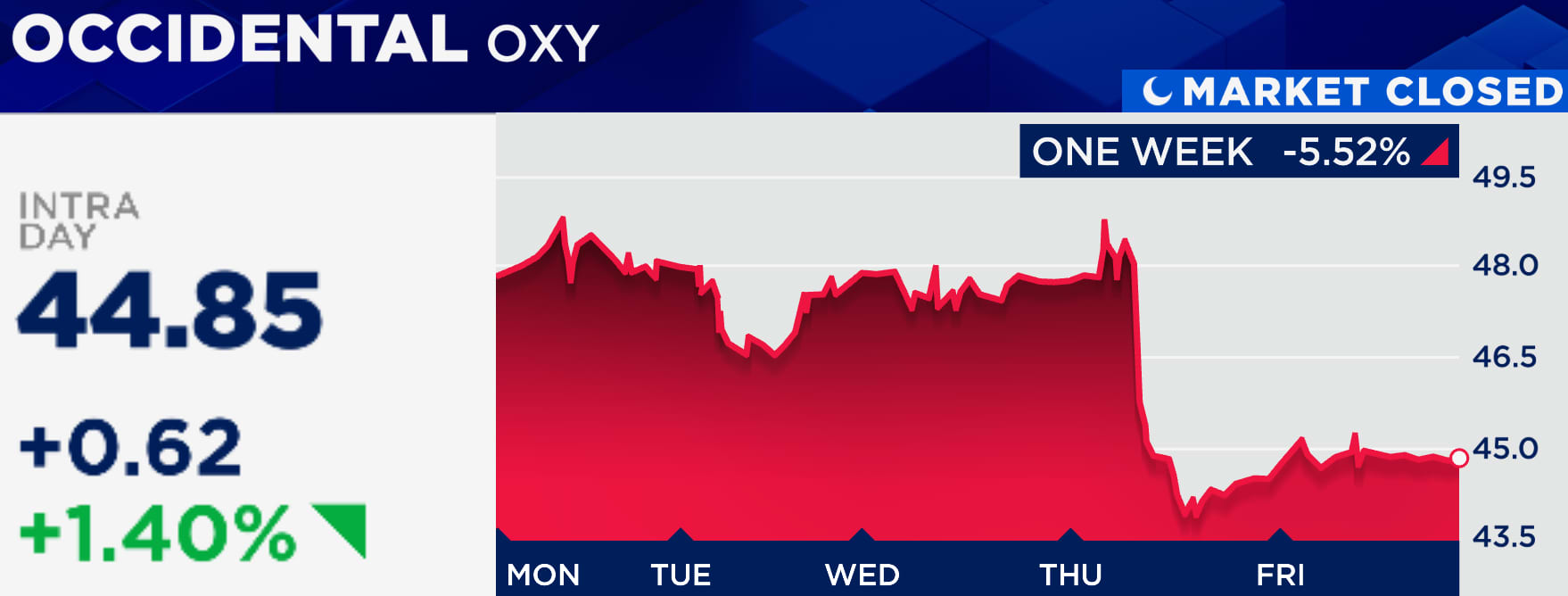 Cổ phiếu Occidental Petroleum giảm tới 8,1% trong ngày công bố thương vụ hôm thứ Năm, sau đó hồi phục nhẹ nhưng vẫn kết tuần ở mức giảm 5,5%.