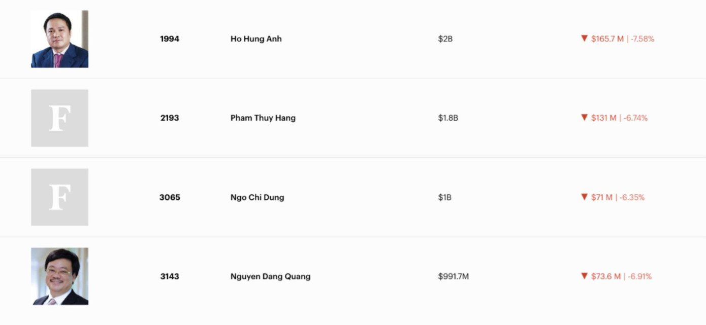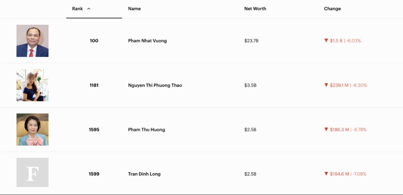 Theo cập nhật từ bảng xếp hạng tỷ phú thời gian thực của Forbes, hầu hết tỷ phú Việt đều ghi nhận mức giảm tài sản 6-7%.