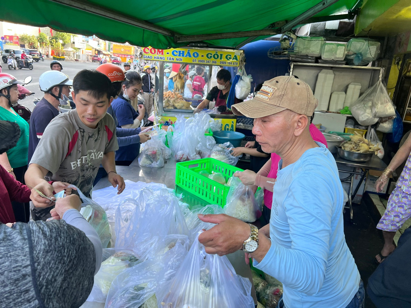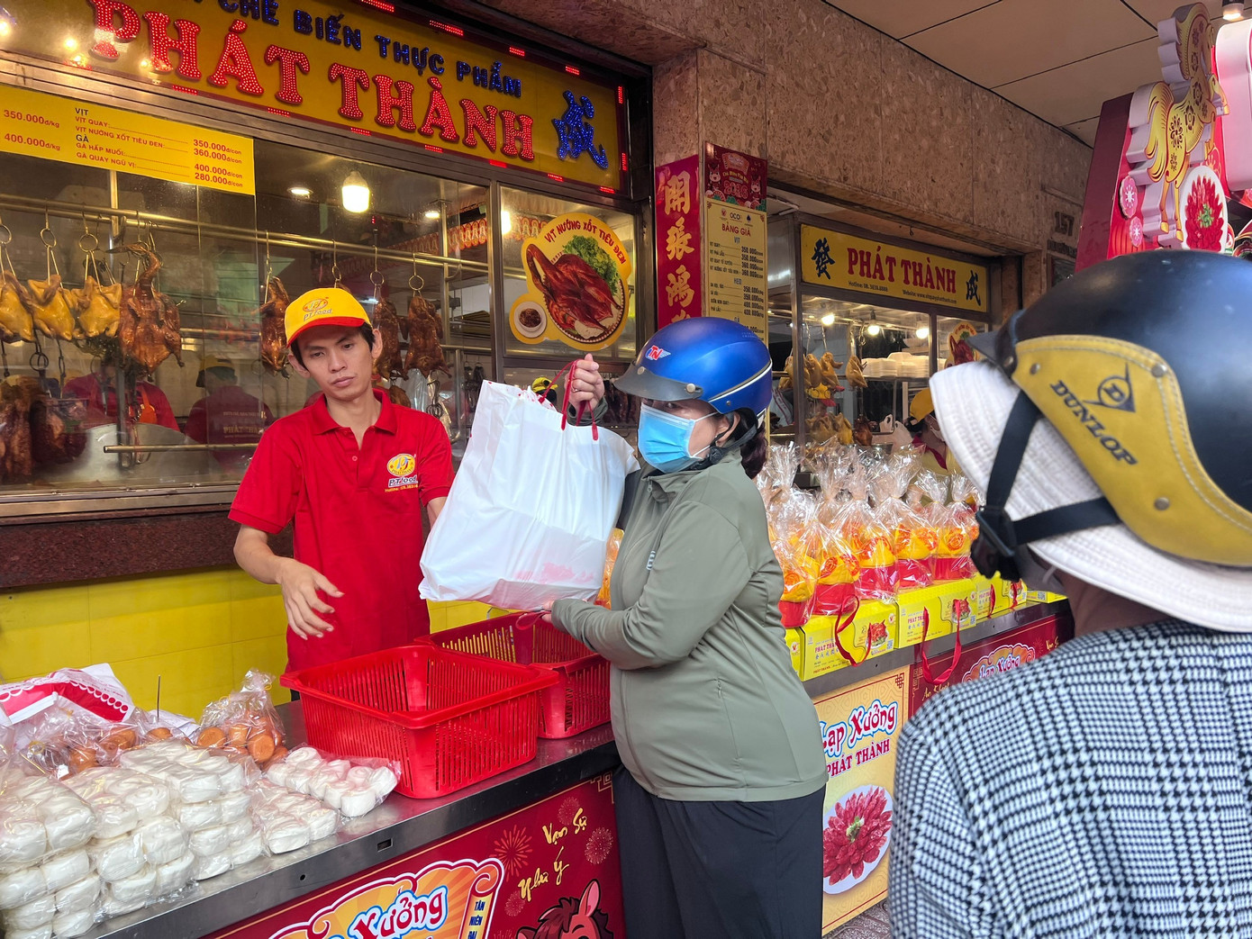 Nhiều người đặt shipper nhận hàng hộ. Một shipper cho biết, từ 5 giờ sáng, ông đã đến đây nhận gà thay khách và các đơn hàng nhờ nhận gà luộc tại cửa hàng này "nổ" liên tục. "Tôi phải chờ khoảng 15 phút mới đến lượt. Tôi nhận được rất nhiều đơn hàng đặt mua gà cúng trong sáng nay" - một shipper chia sẻ.