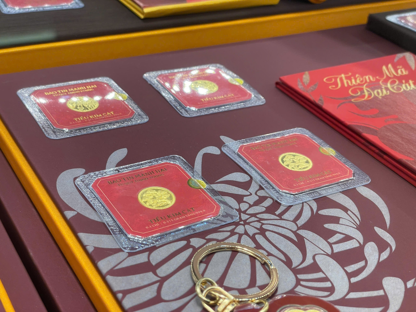 Sản phẩm được săn đón nhiều nhất là vàng Thần Tài loại 0,1 chỉ. Mẫu vàng này được thiết kế theo chủ đề tùng - cúc - trúc - mai, đóng gói niêm phong theo quy chuẩn doanh nghiệp với giá khoảng 1,85 triệu đồng/miếng.