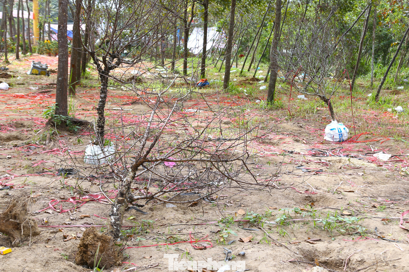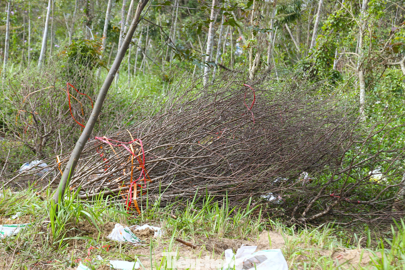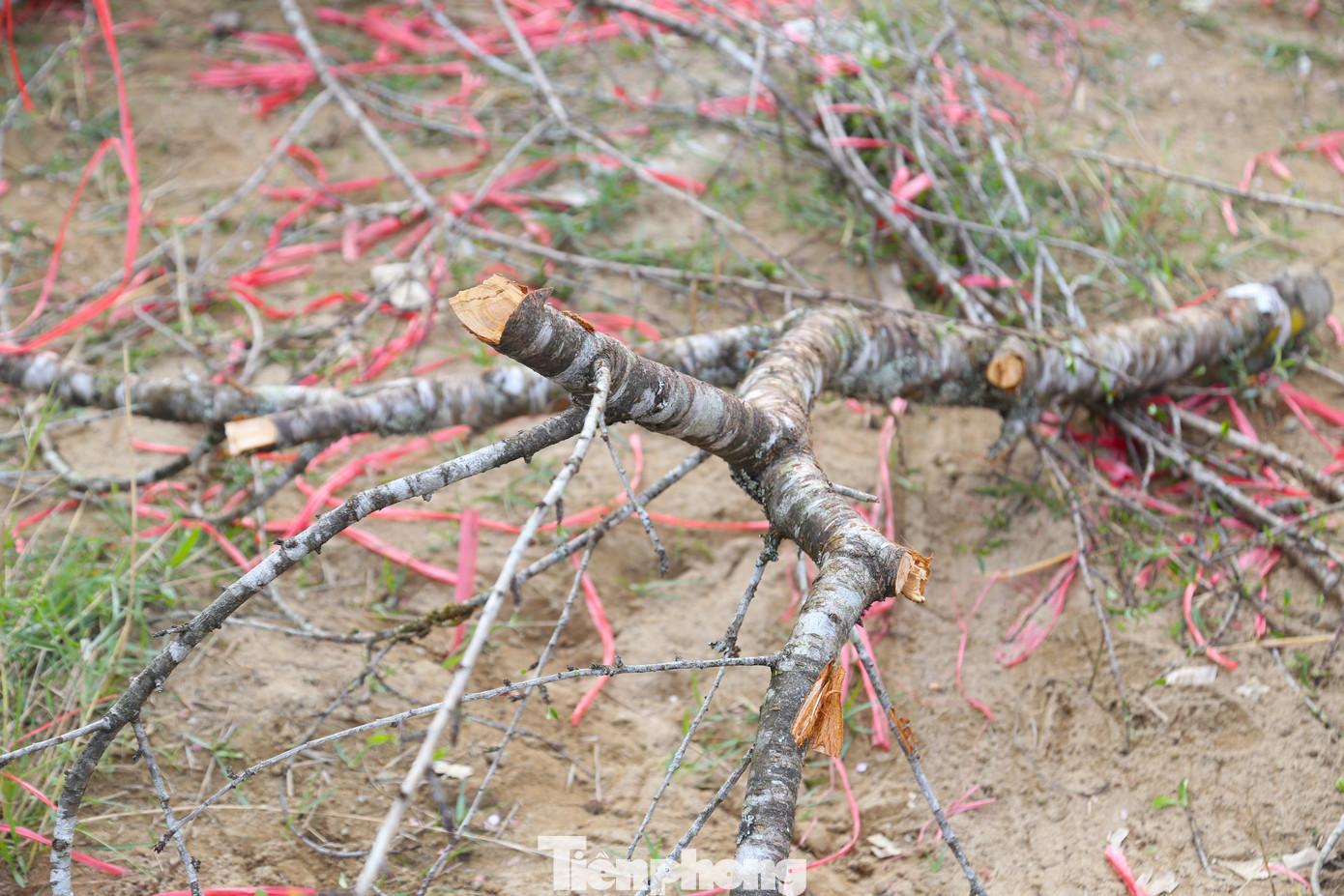 Có cành đào đã bị cưa, có cành bị bẻ gãy nằm lẫn lộn, ngổn ngang với dây buộc.