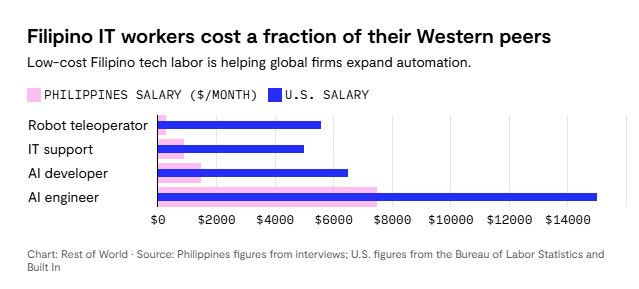 Tờ RoT nhận định Philippines đang ở vị thế đặc biệt trong làn sóng này. Là trung tâm của ngành outsourcing, quốc gia này đang chứng kiến sự bùng nổ việc làm liên quan đến AI, từ huấn luyện mô hình đến vận hành robot và phát triển chatbot. Nhiều kỹ sư trẻ được thuê bởi các tập đoàn quốc tế với mức lương rẻ hơn nhiều so với Mỹ hay Nhật.