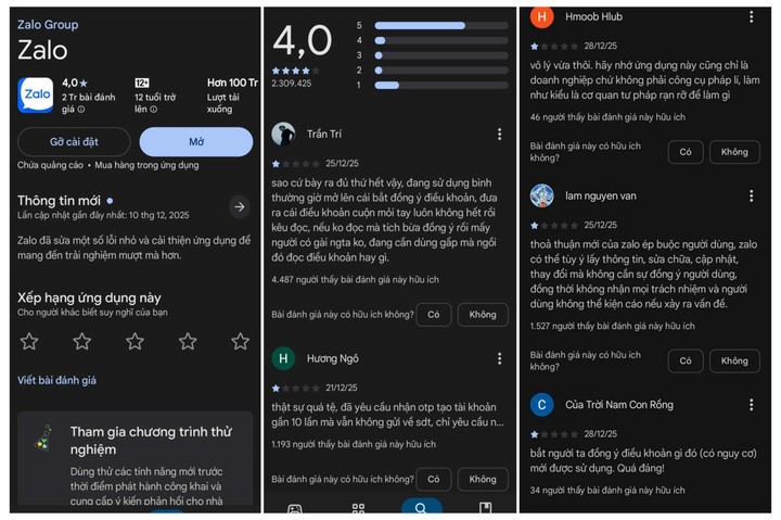 Còn trên kho ứng dụng CH Play cũng liên tục ghi nhận đánh giá 1 sao từ người dùng cho ứng dụng Zalo kể từ khi nền tảng này yêu cầu người dùng "cập nhật điều khoản dịch vụ mới".
