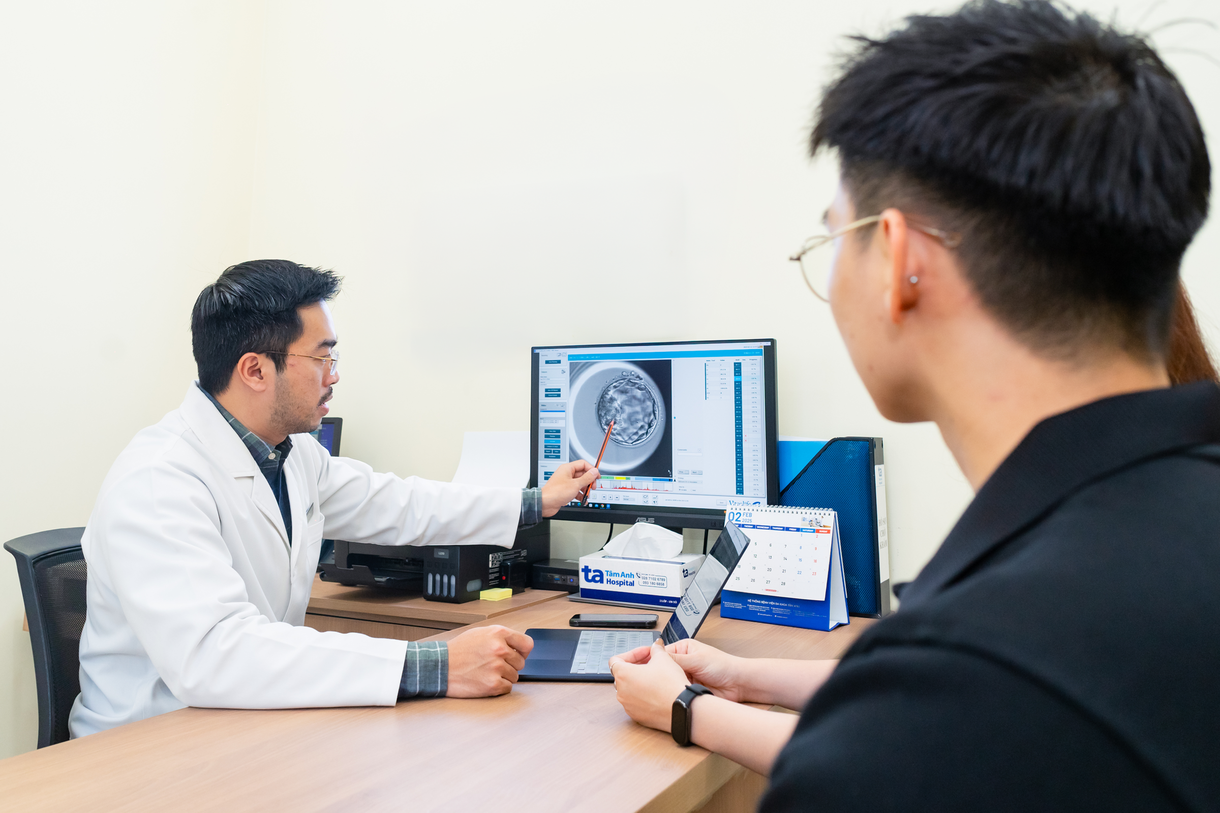Bác sĩ tư vấn quá trình nuôi cấy và phát triển của phôi cho bệnh nhân. Ảnh: IVF Tâm Anh
