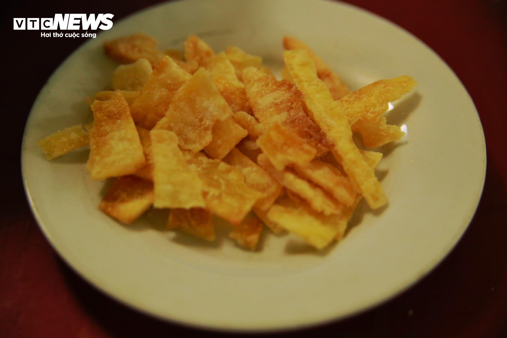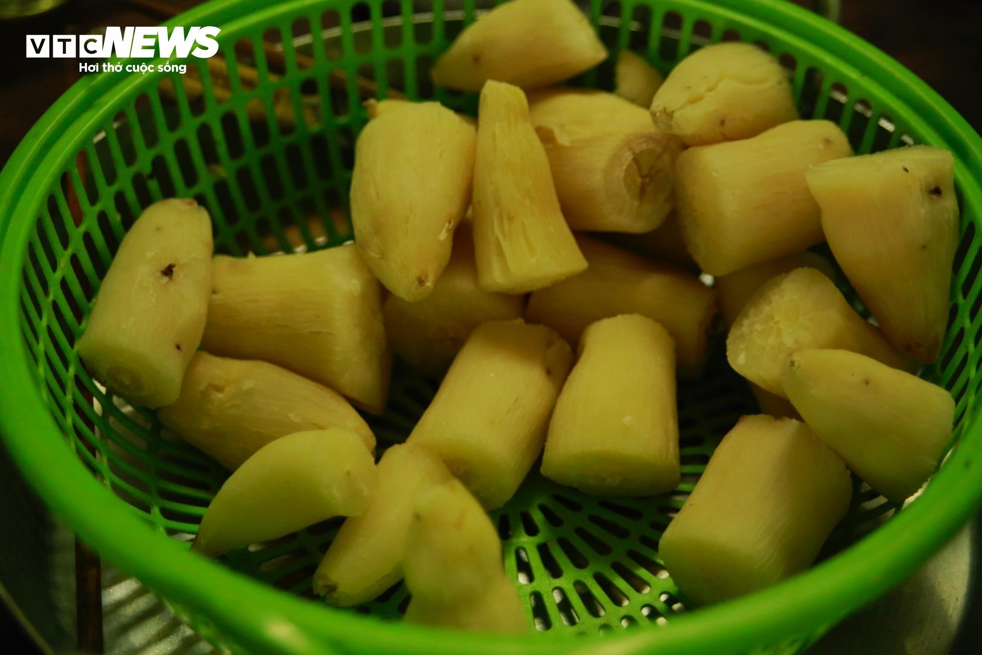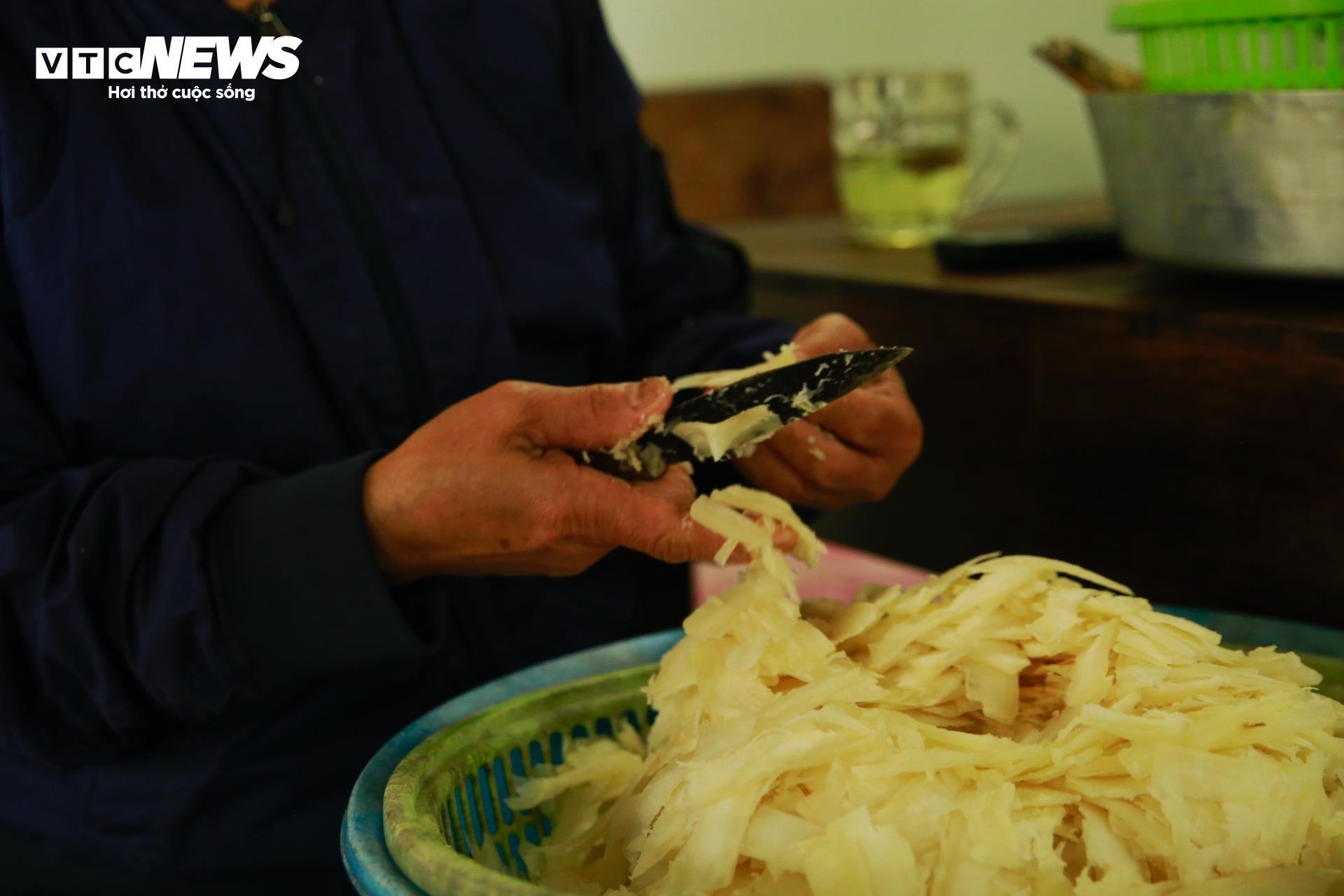 "Để làm ra mứt sắn ngon, từng củ sắn tươi phải được chọn lọc kỹ lưỡng, gọt vỏ, ngâm nước để loại bỏ vỏ nhựa và luộc chín. Sắn được thái miếng vừa ăn và chiên ngập dầu, sau đó đem đi ngào với đường để tạo độ ngọt cho món mứt này...", bà Tư chia sẻ.