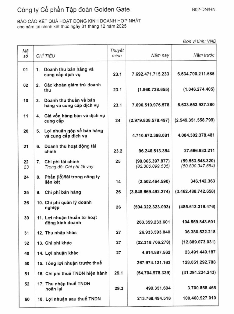 Với các con số này, Golden Gate ghi nhận lợi nhuận trước thuế là 268 tỷ đồng, hơn gấp đôi kết quả 128 tỷ đồng năm 2024. Lợi nhuận sau thuế là 213,8 tỷ đồng, hơn gấp đôi 100,5 tỷ đồng năm 2024.