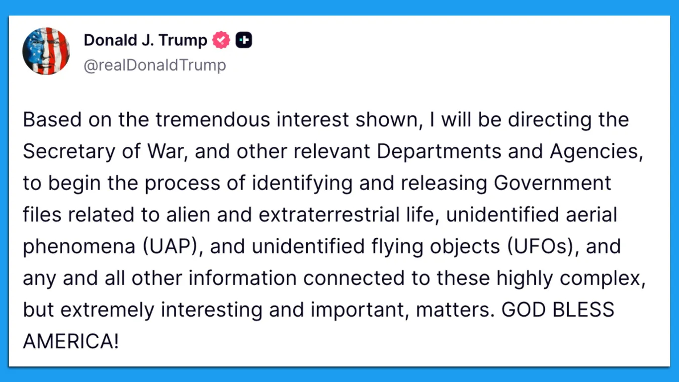 Tổng thống Mỹ Donald Trump đã công bố kế hoạch giải mật các tài liệu chính phủ liên quan đến UFO và UAP, tức các hiện tượng trên không chưa xác định. Theo ông, động thái này nhằm tăng cường minh bạch trước “mối quan tâm rất lớn của công chúng” đối với chủ đề này.